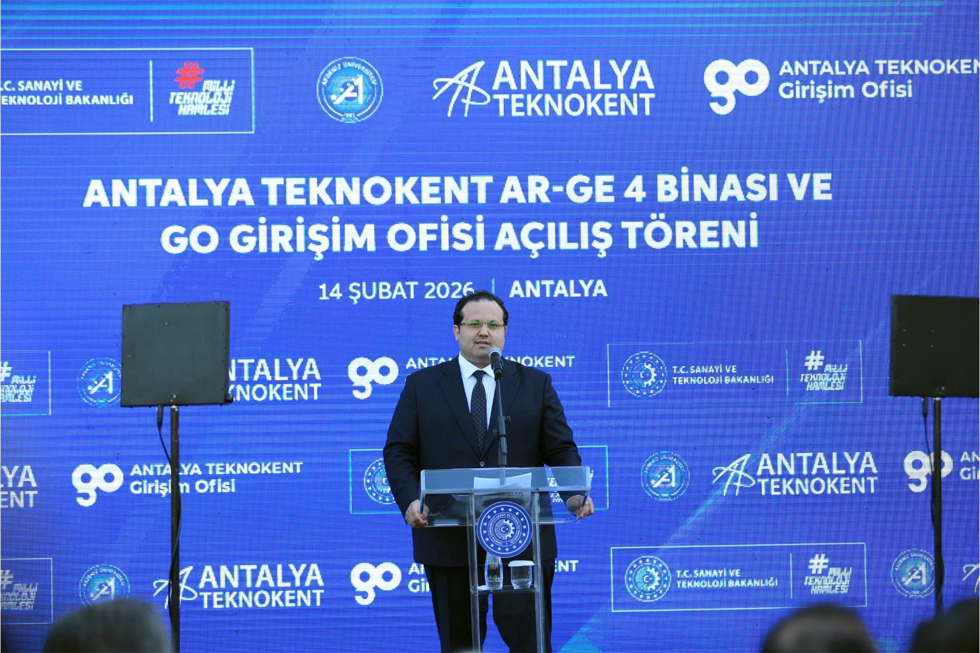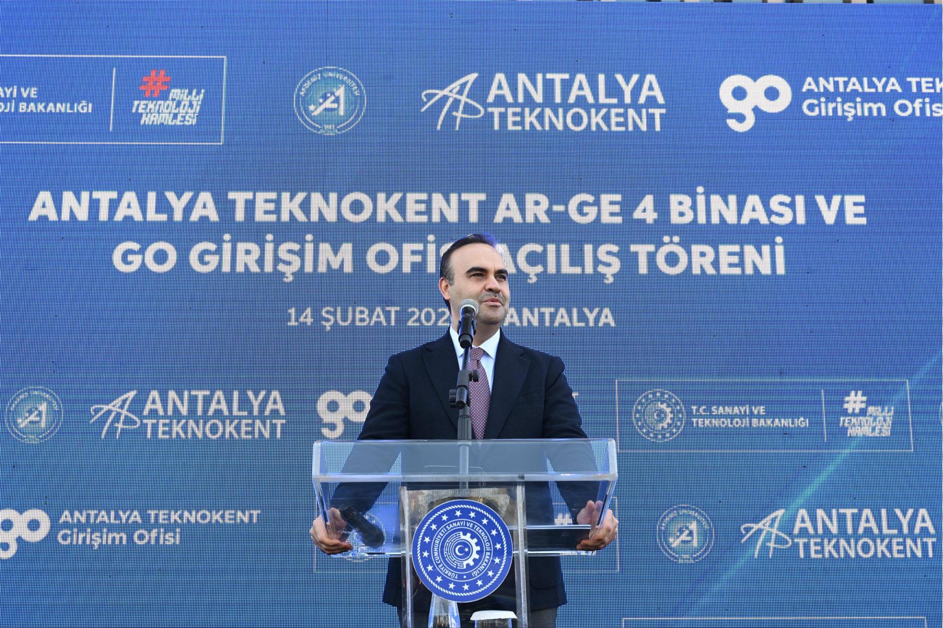 Sanayi ve Teknoloji Bakanı Mehmet Fatih Kacır, “Antalya Teknokent Ar-Ge 4 Binası ve Antalya Teknokent Girişim Ofisi Açılış Töreni vesilesiyle sizlerle bir arada bulunmaktan büyük memnuniyet duyuyorum. Ülkemiz Ar-Ge ve inovasyon ekosisteminin öncü ve örnek altyapılarından Teknoparkımızın yeni hizmet binasının ve Girişim Ofisinin; Antalya'mıza, ülkemize ve milletimize hayırlı olmasını temenni ediyorum.” dedi.